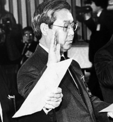 해당 모습은 1988년 12월14일 국회에서 열린 ‘일해재단 비리 청문회’에서 장세동 전 청와대 경호실장이 증인 선서를 하고 있는 사진이다.