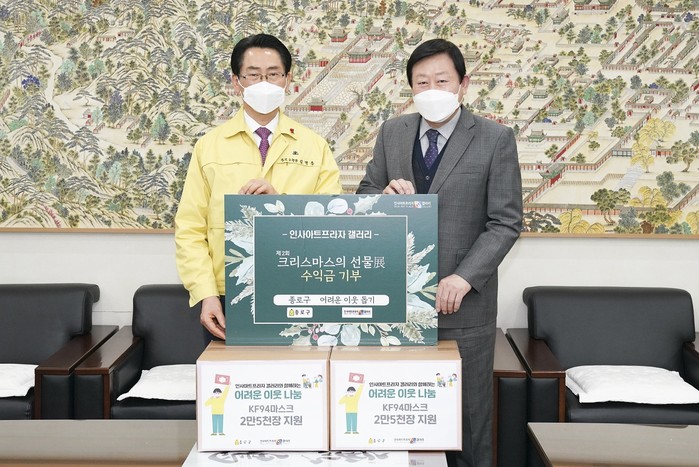 이날 전달식은 인사아트프라자갤러리가 지난해 「크리스마스 선물展」 전시회의 판매 수익금으로 구매한 KF94마스크 2만 5천장을 전달하는 자리로 인사아트프라자 박복신 대표, 인사아트프라자갤러리 허성미 관장이 함께 했다.