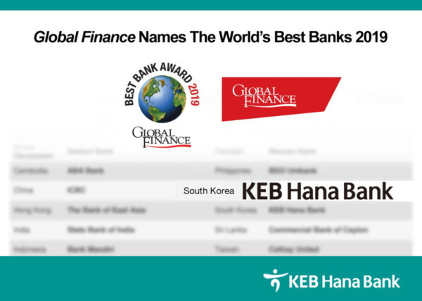 KEB하나은행은 IMF 연차 총회 기간 중인 지난 19일(현지시간 기준) 미국 워싱턴D.C. 내셔널프레스클럽에서 진행된 글로벌파이낸스지 주최 ‘아시아 최우수 은행 시상식’에서 대한민국 최우수 은행(Best Bank in Korea 2019)상을 수상했다.