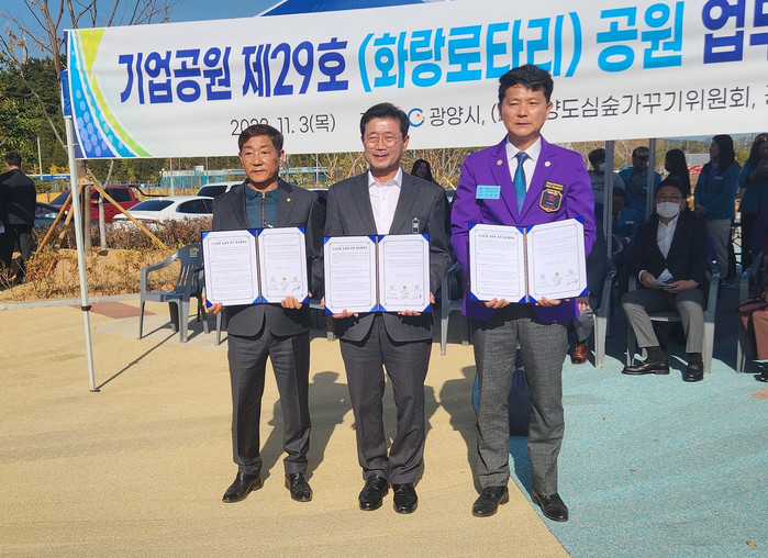 행사는 광양도심숲가꾸기위원회 주관으로 국제 3610지구 광양화랑로타리클럽(회장 박병관) 회원이 공원 내에 2천만 원 상당의 조경수 8종 1,527주를 기증해 식재하고, 향후 3년간 기업공원을 쾌적하고 아름다운 공원으로 조성하기 위한 업무협약식을 했다.