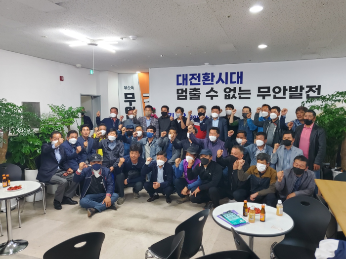 | ▲ 무소속 김 산 예비후보의 무안지역 9개읍면 핵심 지지자들이 긴급모임을 마친 뒤 파이팅을 외치고 있다.(김산 무안군수예비후보사무실) |
