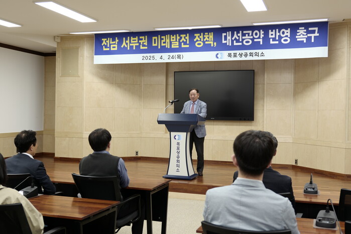 [목포=황승순 기자]목포상의(회장 정현택)는 24일, 오는 6.3 조기 대선을 앞두고 전남 서부권의 대약진을 위한 핵심 현안을 각 정당과 후보자 공약에 반영해 줄 것을 촉구하는 성명을 발표했다.