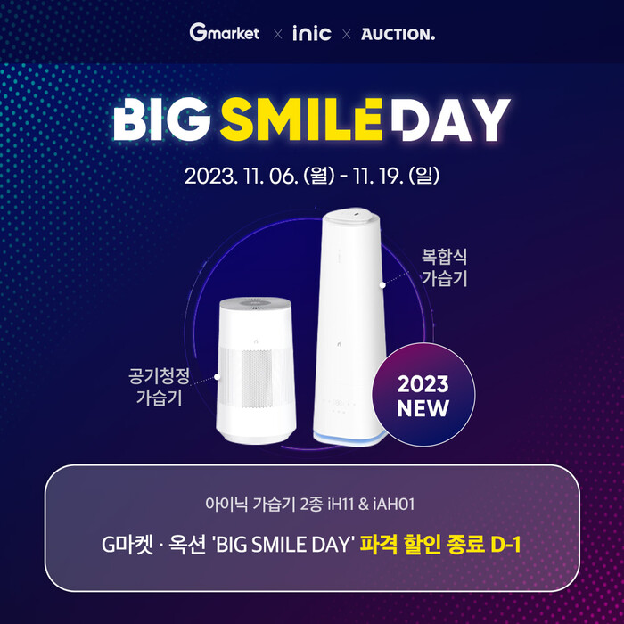 [시민일보 = 이창훈 기자] 생활가전 브랜드 ㈜아이닉이 6일부터 19일까지 진행되는 ‘G마켓·옥션 빅스마일데이’ 행사의 종료를 단 하루 앞뒀다고 밝혔다. 이번 행사는 아이닉의 인기 전 제품은 물론, 23년도 출시된 가습기 2종을 최대 59% 할인된 가격에 선보이고 있다.