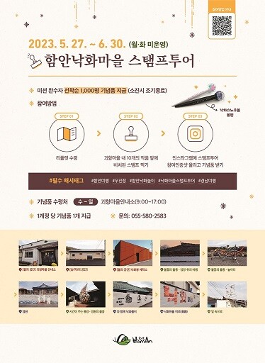 ‘낙화마을 스탬프투어’ 참여방법은 함안낙화놀이 행사 전 괴항마을에서 낙화놀이 테마의 작품들을 감상하고, 작품 앞에 놓인 스탬프 10개를 모두 찍는다. 이를 SNS에 인증하면 괴항마을안내소에서 함안낙화놀이를 형상화한 스노우볼 볼펜을 선착순 1000명에게 지급한다.