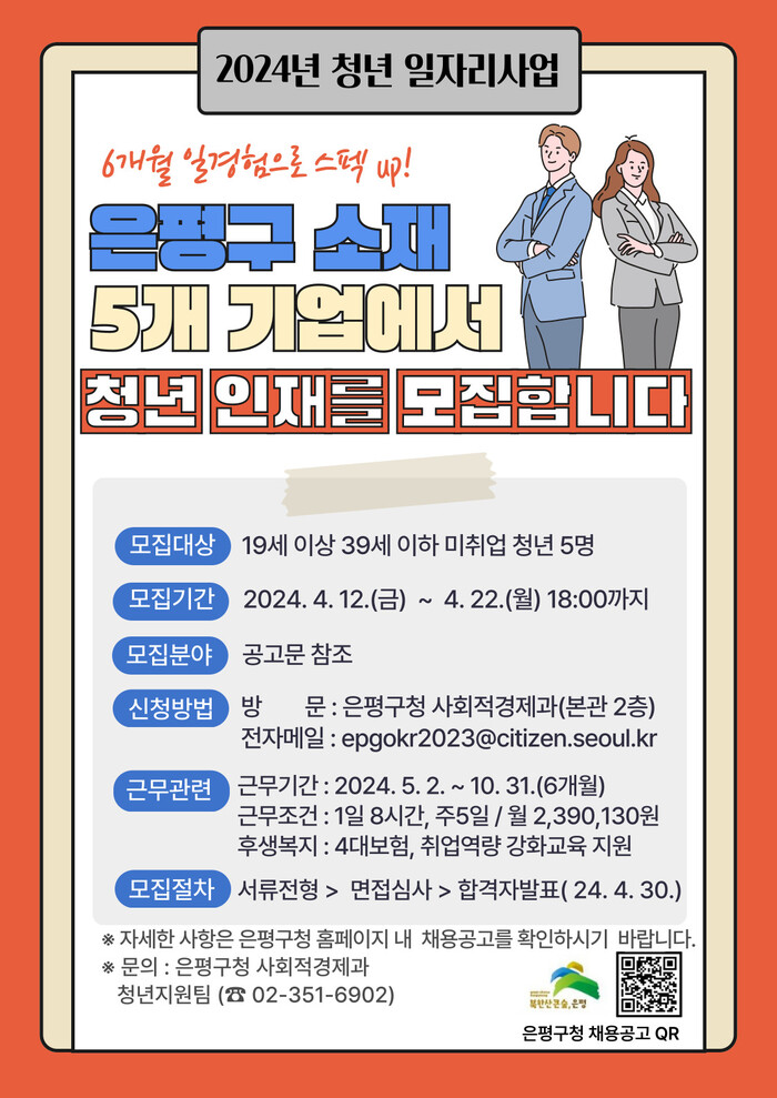 모집 대상은 공고일 기준 19세 이상 39세 이하 청년 구직자로, 은평구 거주자를 우선한다. 본인의 전공과 희망진로 등을 고려해 원하는 분야에 지원하면 된다.