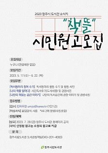 청주시민이면 누구나 응모할 수 있으며, 참여 희망자는 도서관 홈페이지에서 신청 서식을 내려 받아 A4 용지 2매 분량으로 작성한 뒤 오는 6월 22일까지 전자우편 으로 제출하면 된다.