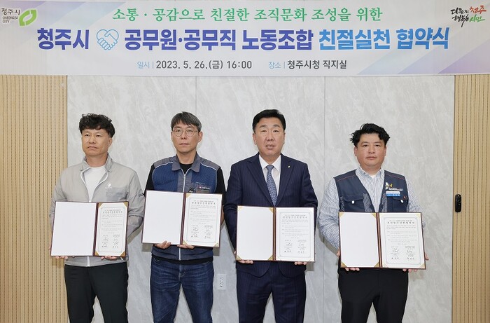 협약을 맺은 노동조합 관계자는 “시의 친절행정을 위한 정책 등에 적극적으로 협조해 시민들이 체감할 수 있는 따뜻한 청주시를 만들기 위해 노력하겠다”고 말했다.