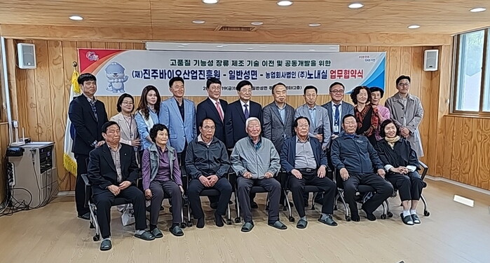 (재)진주바이오산업진흥원(원장 정영철), 진주시 일반성면(면장 류덕희), 답천마을 농업회사법인 ㈜노내실(대표 황웅진)이 19일 일반성면 주민자치센터 2층에서 업무협약식(MOU)을 가졌다.