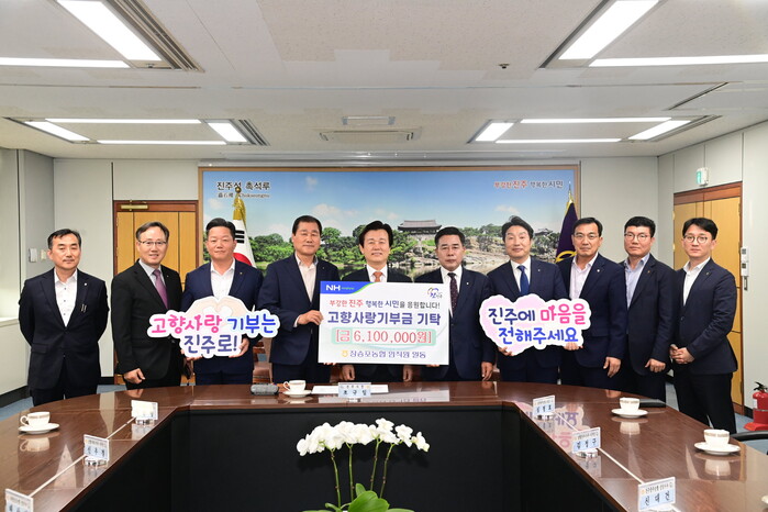 진주시는 18일 시청 5층 기업인의 방에서 거제장승포농협 임직원들로부터 2년 연속으로 고향사랑기부금 610만 원을 기탁받았다고 전했다.