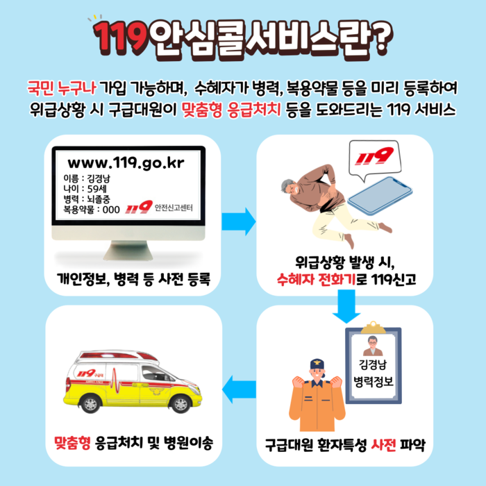 119안심콜서비스는 장애가 있거나 고령자, 임산부, 위험군 병력자 등에게 위급상황 발생 시 구급대원이 신고자(환자)의 질병과 특성을 미리 알고 출동해 맞춤형으로 응급처치와 병원 이송이 가능한 서비스다.