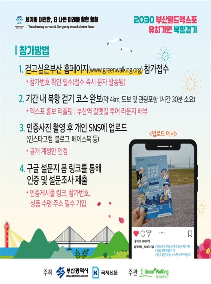 인증사진은 ▲출발지인 ‘부산역 갈맷길 투어 라운지’에서 나눠 줄 엑스포 홍보 리플릿과 함께 찍은 걷기 코스 사진 ▲참가자 얼굴과 함께 찍은 부산항대교, 광장, 여객터미널 등의 풍경 사진 ▲북항 내 새로 만든 엑스포 포토존 사진 등을 올리면 된다.