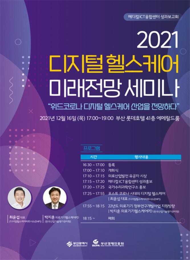 부산시(시장 박형준)는 오는 16일 오후 5시 롯데호텔 부산에서 「2021년 메디컬 ICT 융합센터 성과보고회」를 개최한다고 밝혔다.