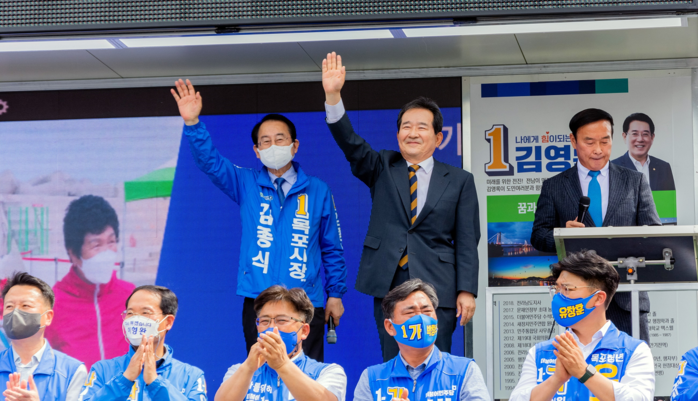 | ▲ 김종식 시장 후보, 정세균 전 대표 지원속 목포역 광장에서 출정식(출처=김종식 목포시장 후보 선거사무소) |