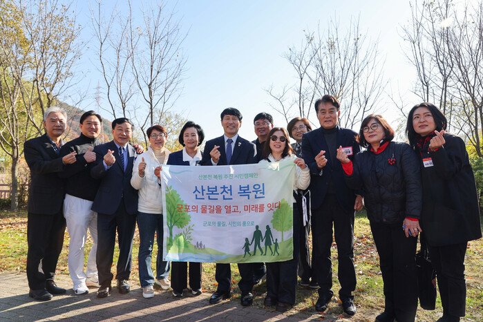 | ▲ 하은호 군포시장(오른쪽 두번째)이 군포시민 걷기 대잔치 참가자들과 기념 촬영을 하고 있다 /사진제공=군포시 |