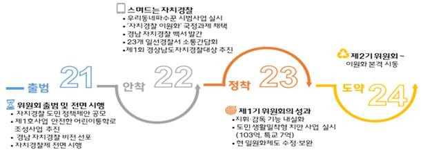 경상남도자치경찰위원회는 그간 자치 경찰 제의 안정적 운영 기반을 구축하고 경남형 자치 경찰 사업 발굴에 힘써왔다. 특히, 경남 자치 경찰 제1호 사업 ‘집에서 학교까지 안전한 어린이 통학로 조성 사업’은 경상남도자치경찰위원회-경상남도-경남 경찰청-경남 교육청-도로 교통 공단 등이 협업으로 추진하여 어린이 교통사고 발생 건수가 사업 시행 전 대비 21.8%(130건) 감소했다.