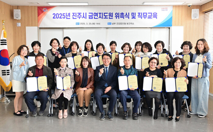 이번에 위촉된 금연지도원은 2025년 4월 1일 부터 2년간 활동 예정이며 「국민건강증진법」과「진주시 금연환경조성 및 간접흡연 피해방지 조례」에 따라 ▲금연구역 시설기준 이행 상태 점검 ▲금연구역에서의 흡연행위 감시 및 계도 ▲금연을 위한 조치를 위반한 경우 행정관청에 신고하거나 그에 관한 자료 제공 ▲금연홍보 및 금연교육 지원 ▲금연환경 조성을 위한 지도 등의 직무를 수행하게 된다.