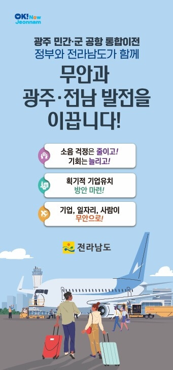 [남악=황승순 기자]전라남도는 전남·광주·무안의 상생과 도민의 오랜 염원을 이루기 위해 광주 민간·군 공항의 무안국제공항 통합이전을 ‘더 이상 미룰 수 없는 시대적 과제’로 규정하고 강력히 추진할 계획이라고 밝혔다.