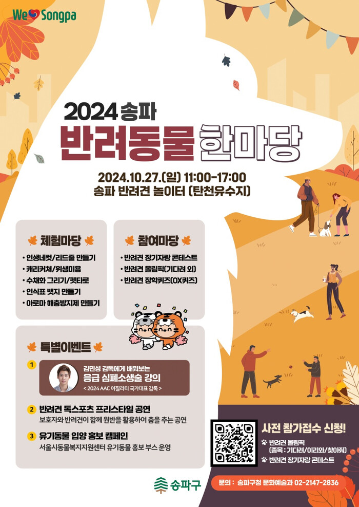 서강석 송파구청장은 “송파구는 서울 자치구 2위, 3만 6천 마리 등록동물이 사는 만큼 반려인구의 니즈도 다양하다. 앞으로도 구민 눈높이에 맞는 반려동물 사업을 추진해 나갈 것”이라며 “청명한 계절, 반려견과의 가을 나들이로 행복한 추억 만들어 돌아가시길 바란다”고 전했다.