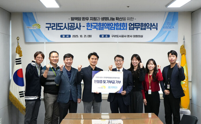 유동혁 구리도시공사 사장은“이번 협약을 통해 공사 임직원 모두가 생명 나눔에 동참하고, 환우분들에게 실질적인 희망이 전해지기를 바란다”며“앞으로도 공기업으로서 지역사회와 함께하는 다양한 사회공헌활동을 지속적으로 추진해 나가겠다”고 말했다.