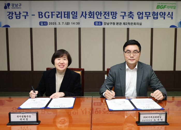 | ▲ 250307 강남구-BGF리테일 업무협약식(왼쪽부터 옥미정 복지생활국장. 노수덕 (주)BGF리테일 강남지역부장) |