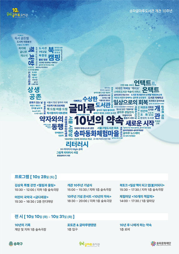 서강석 송파구청장은 “송파구민의 관심과 사랑 속에 송파글마루도서관이 개관 10주년을 맞이한 것을 뜻깊게 생각한다”며, “앞으로도 구민들의 독서문화 활성화를 위해 다양한 분야의 책과 문화 행사를 제공하는 송파구 대표 구립도서관이 되도록 적극 지원하겠다.”고 전했다.