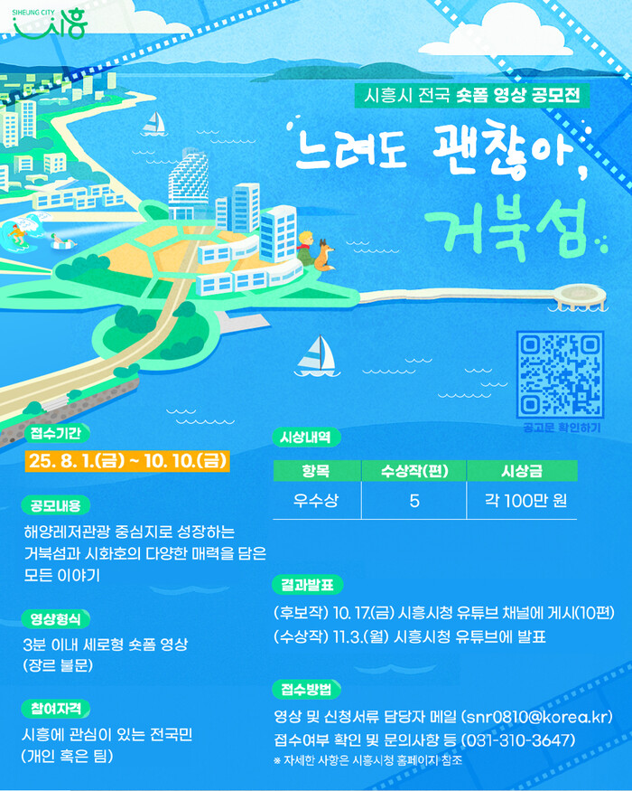 [시흥=송윤근 기자] 경기 시흥시(시장 임병택)가 거북섬과 시화호의 해양레저ㆍ생태환경ㆍ관광자원 등의 다양한 매력을 널리 알리고자 오는 10월 10일까지 전 국민을 대상으로 ‘느려도 괜찮아, 거북섬’ 숏폼 영상 공모전을 개최한다.