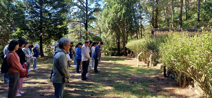 | ▲ 연수생들이 석주관성의 칠의사 단(임진왜란, 정유재란 당시 의병을 기리는 단) 앞에서 의병들을 추모하고 있다.(출처=전남도교육청) |