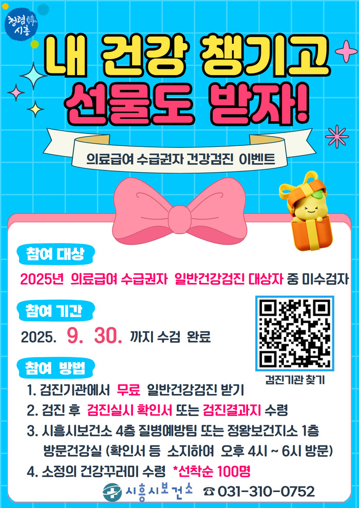 이형정 시흥시보건소장은 “일반건강검진은 건강을 지키는 가장 기본적인 수단”이라며 “이번 이벤트를 통해 많은 대상자가 검진에 참여해 건강한 일상을 누리기를 바란다”라고 전했다.