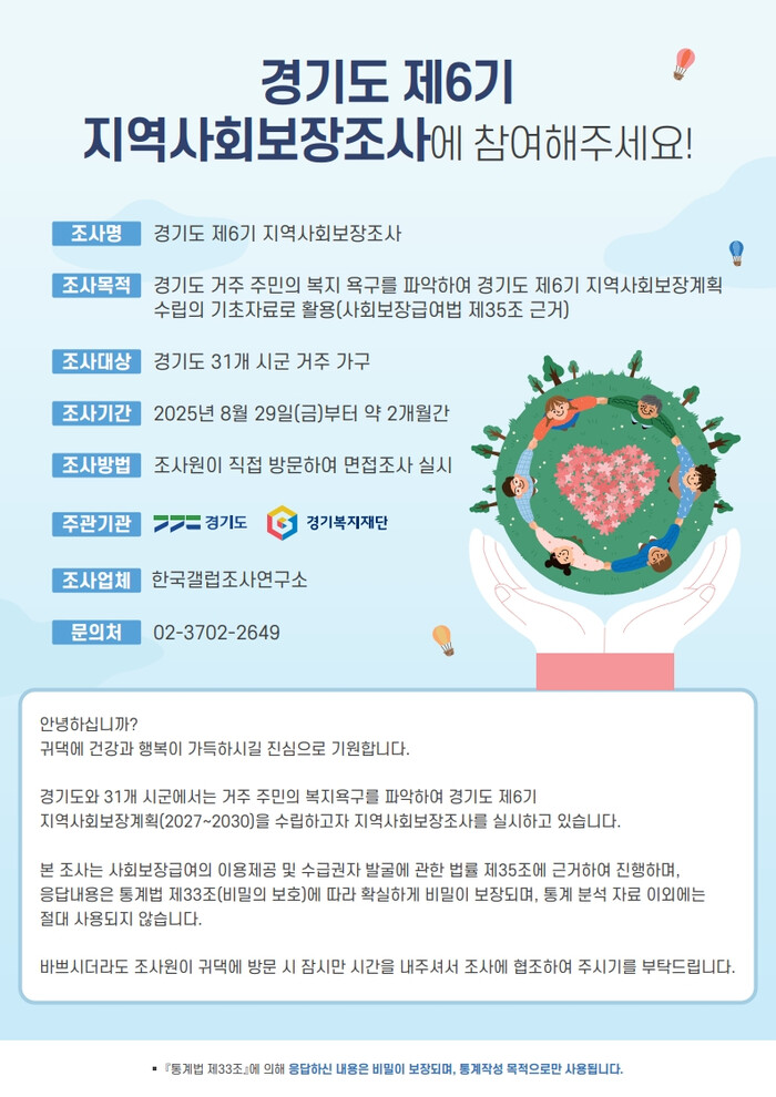 한편, 조사 관련 자세한 사항은 경기도 제6기 지역사회보장조사 누리집에서 확인할 수 있다.