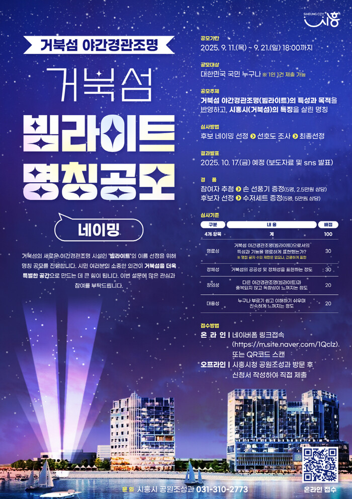 이번 공모는 시흥시의 대표 야간 관광 명소로 자리매김할 거북섬의 정체성과 지역적 특성을 반영한 명칭을 시민과 함께 만들어가기 위해 마련됐다. 선정된 명칭은 향후 홍보 및 관광 콘텐츠에 적극 활용할 예정이다.