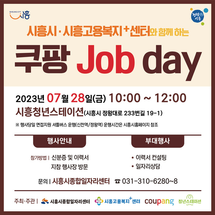 이번 ‘시흥시·시흥고용복지+센터와 함께하는 쿠팡 Job day’는 쿠팡 2센터(물류입·출고, 상하차), 쿠팡 3센터(반품 업무) 등 각 센터에서 100명 이상을 채용할 예정이다.