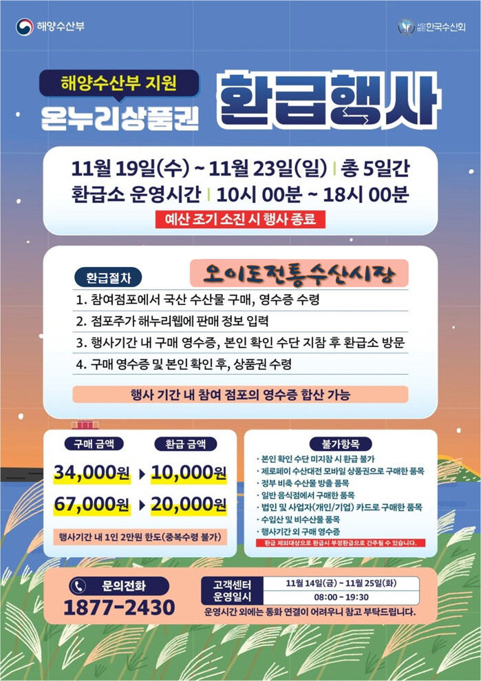 환급 대상은 국내산 수산물과 함께, 70% 이상의 국내산 원료를 사용한 젓갈류 등 일부 가공식품도 포함된다. 다만, 일반 음식점에서 구매한 물품, 제로페이 수산대전 상품권을 이용한 결제, 정부 비축 수산물, 수입산 수산물 등은 환급 대상에서 제외된다.