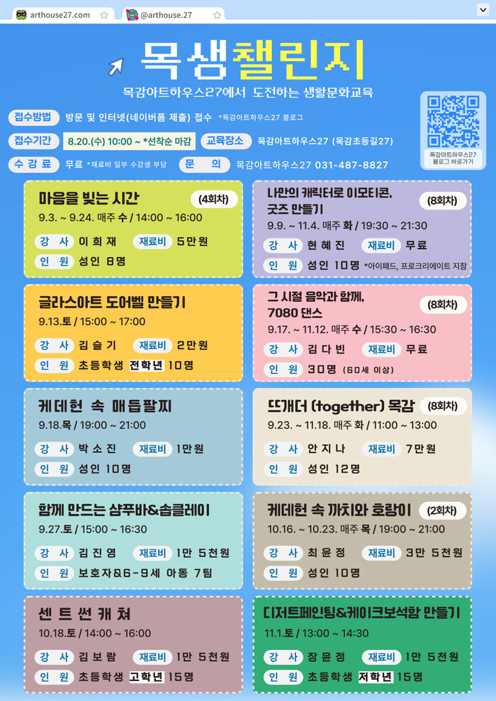 [시흥=송윤근 기자] 경기 시흥시(시장 임병택)는 목감아트하우스27에서 진행하는 2025년 하반기 생활문화교육 ‘목생챌린지’ 참여자를 모집한다.