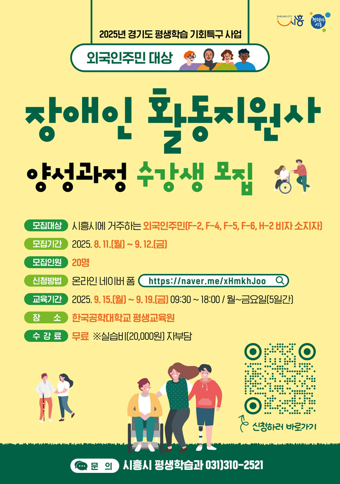 [시흥=송윤근 기자] 경기 시흥시(시장 임병택)는 2025년 경기도 평생학습 기회특구 사업의 일환으로, 외국인주민의 안정적인 지역 정착과 취업을 지원하기 위해 ‘장애인활동지원사 양성과정’을 개설하고 오는 9월 12일까지 수강생을 모집한다.