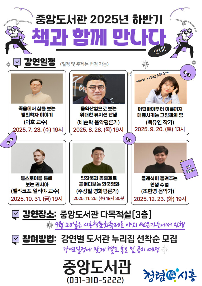 시흥시중앙도서관 관계자는 “하반기 ‘책과 함께 만나다’에서 사회적 문제나 시민의 설문조사를 반영해 다양한 저자를 모시고자 노력했다”라며 “문화적 소양 함양을 위한 인문학 강연에 많은 관심과 참여를 바란다”라고 밝혔다.