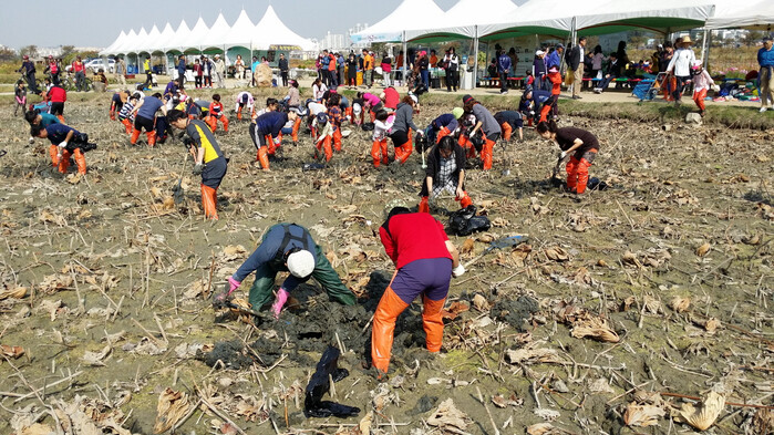 | ▲ 지난 2023년 '가족과 함께하는 호조벌 연근 캐기' 행사 진행 모습 /사진제공=시흥시 |