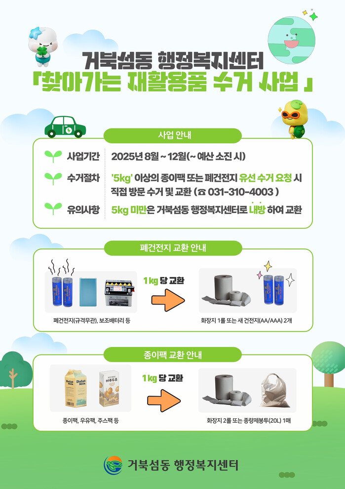 사업은 거북섬동 관내 카페, 학교, 공공기관 등 재활용품이 많이 발생하는 장소를 중심으로 운영되며, 종이팩 또는 폐건전지를 5kg 이상 모아 수거를 요청하면 일정에 맞춰 현장 방문이 이뤄진다. 교환 기준은 폐건전지 1kg당 화장지 1롤 또는 새 건전지(AA 또는 AAA) 2개다. 수거 신청 및 문의는 거북섬동 행정복지센터로 하면 된다.