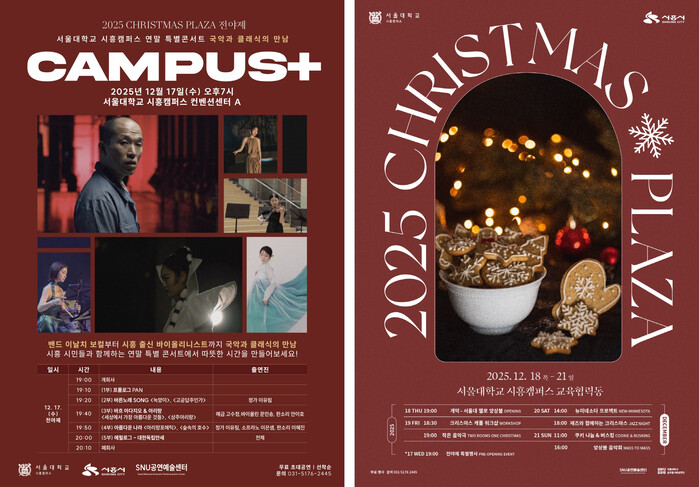 [시흥=송윤근 기자] 경기 시흥시(시장 임병택)와 서울대학교 시흥캠퍼스가 오는 12월 17일부터 21일까지 특별 행사인 ‘2025 크리스마스 플라자(CHRISTMAS PLAZA)’를 개최한다. 올해 행사는 단 하루만 열리는 전야제 특별콘서트 ‘캠퍼스 플러스’를 중심으로, 국악과 클래식을 대표하는 최정상급 연주자들이 한자리에 모여 연말 분위기를 고조시킬 예정이다.