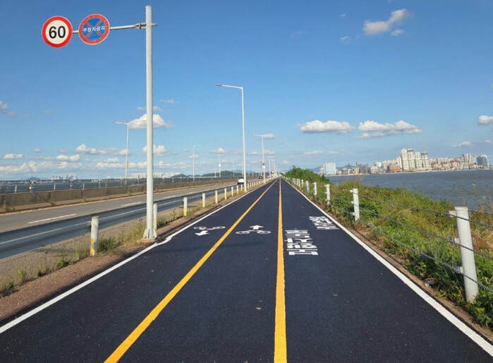 [시흥=송윤근 기자] 경기 시흥시(시장 임병택)는 지난 9월 8일부터 18일까지 시화호 방조제 자전거도로 3.8km 구간에 대한 재포장 및 도색 정비 공사를 완료했다.
