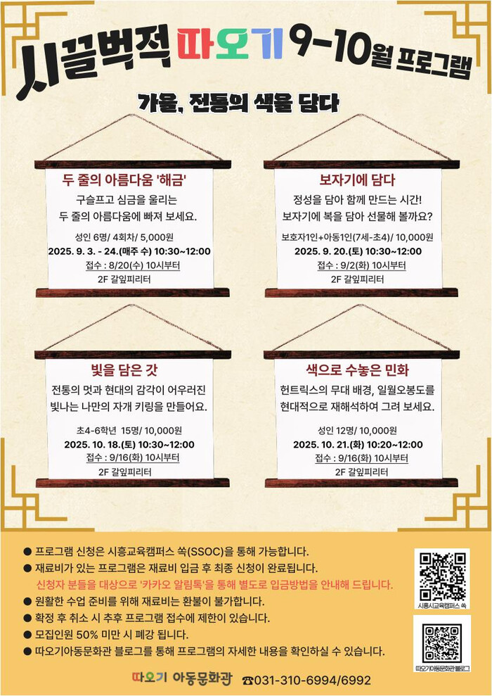 따오기아동문화관 관계자는 “최근 ‘케데헌’을 계기로 전통문화에 관한 관심이 높아진 만큼, 이번 가을 프로그램이 아이들과 가족 모두가 우리 문화의 가치를 체감하는 소중한 기회가 되길 바란다”라고 말했다.