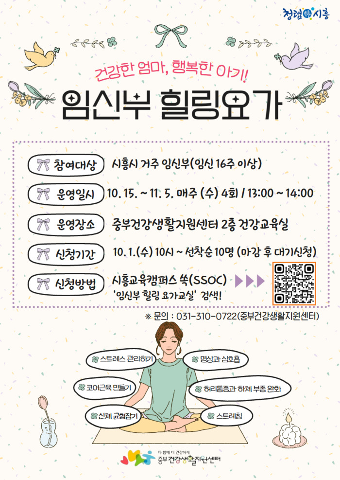 요가 교실은 매주 수요일 오후 1시부터 2시까지 중부건강생활지원센터 2층 건강교육실에서 진행된다. 참여 희망자는 10월 1일부터 시흥교육캠퍼스 쏙(SSOC)을 통해 무료로 신청할 수 있으며, 모집 마감 후에는 대기 신청도 가능하다.