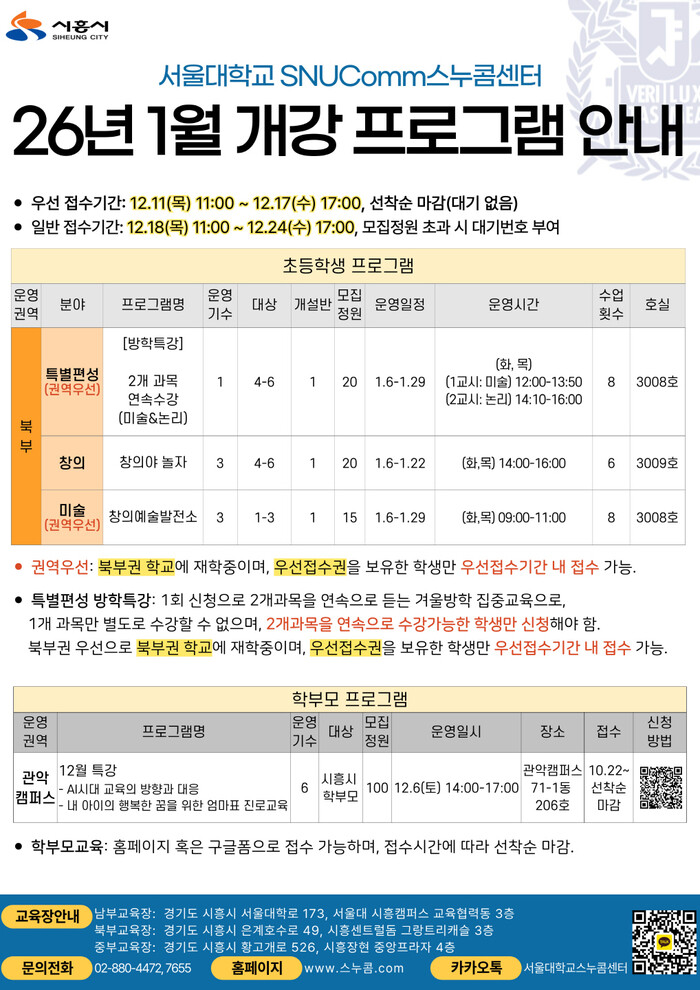 스누콤 방학 특강 및 1월 개강 프로그램 수강생 모집은 스누콤 누리집에서 진행된다. 연 1회 제공되는 우선접수권 보유자는 12월 11일부터, 일반 접수는 12월 18일부터 시작된다.