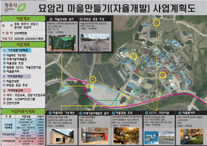 시에서 추진하는 문의면 묘암리 마을만들기 사업은 2021년에 예비계획지구로 선정해 2022년부터 2024년까지 3년간 5억 원을 투자하는 사업이다.