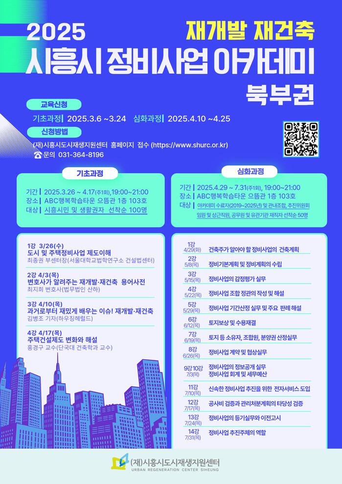 ‘2025 시흥시 정비사업 아카데미’는 재개발ㆍ재건축 등 정비사업에 대한 올바른 이해를 돕고 꼭 필요한 정보를 제공하는 강의로, 올해는 상반기 북부권과 하반기 남부권으로 운영된다.