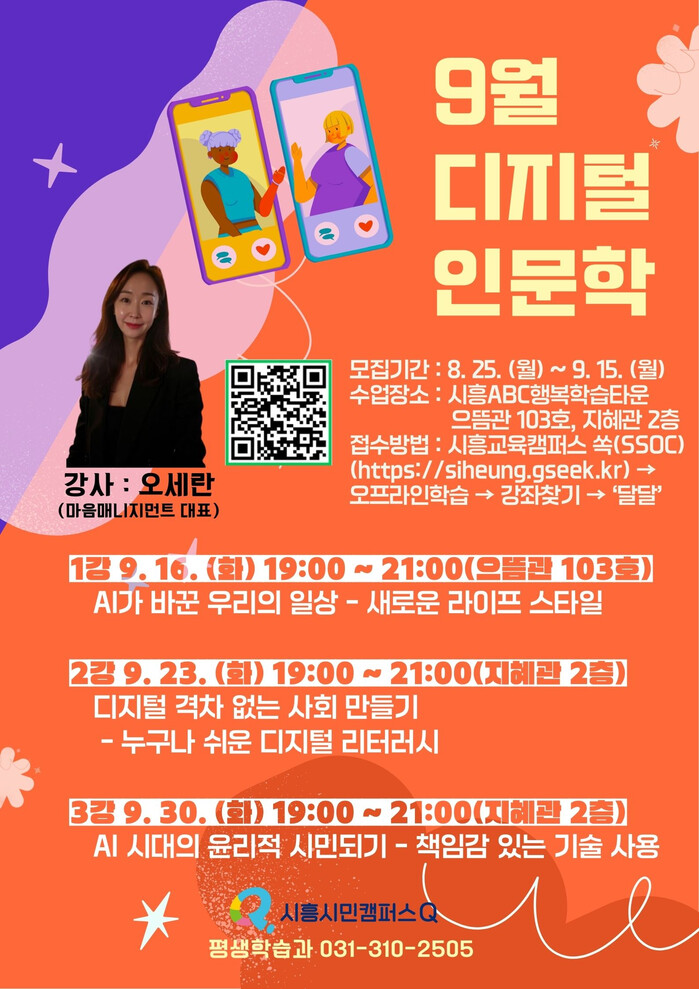 이번 2학기 강좌는 디지털 인문학, 상실 인문학, 마케팅 인문학을 주제로 진행되며, 9월부터 11월까지 매월 3회씩 화요일 오후 7시부터 9시까지 시흥ABC행복학습타운 으뜸관과 지혜관에서 무료로 열린다.