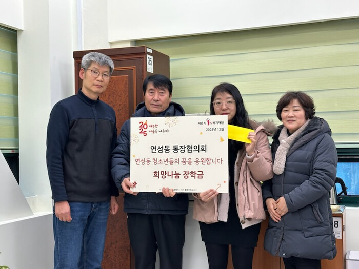 강문원 연성동 통장협의회장은 “연성동의 미래인 청소년들이 어려운 환경 속에서도 자신의 꿈을 잃지 않고 꿋꿋하게 성장하기를 바란다”라며 “앞으로도 연성동 통장협의회는 이웃들에게 실질적인 힘이 될 수 있는 나눔 활동을 이어 가겠다”라고 말했다.