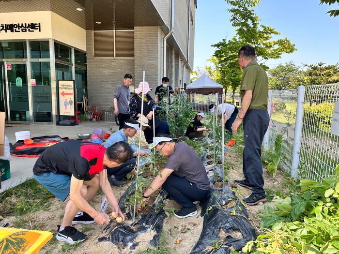 | ▲ 시흥시치매안심센터는 지난 18일 만 65세 미만에 발병한 젊은 치매 환자를 대상으로 운영되고 있는 초로기 쉼터 이용자들과 ‘감자 캐기’ 행사를 센터 내에서 진행했다 /사진제공=시흥시 |