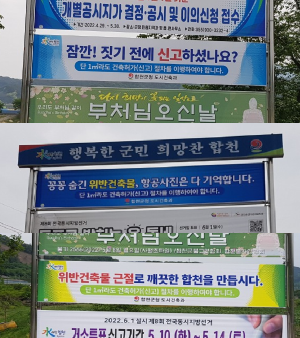 합천군이 올바른 건축문화와 쾌적한 농촌 주거환경 조성을 위해 설치한 이색 현수막이 눈길을 끌고 있다.