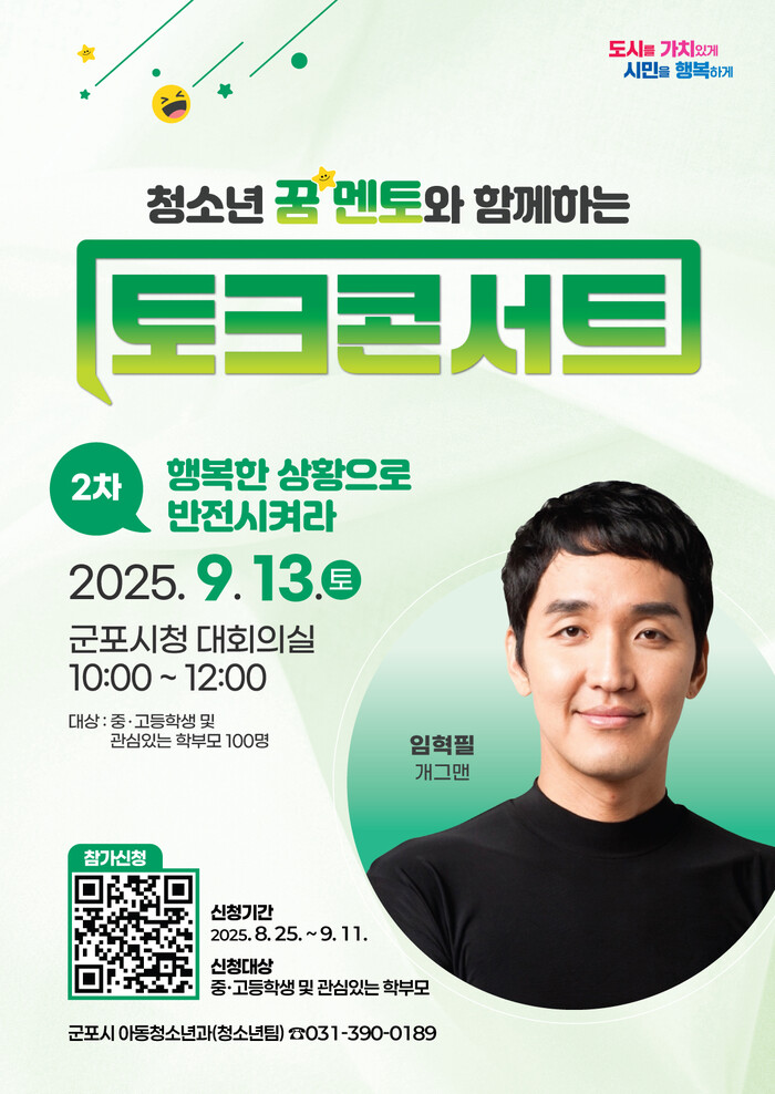 군포시 관계자는 “이번 토크콘서트는 단순한 강연을 넘어, 청소년들이 멘토와의 만남을 통해 자신의 미래를 주도적으로 탐색할 수 있는 계기가 될 것”이라며 “많은 중·고등학생들의 관심과 참여를 바란다”고 전했다.