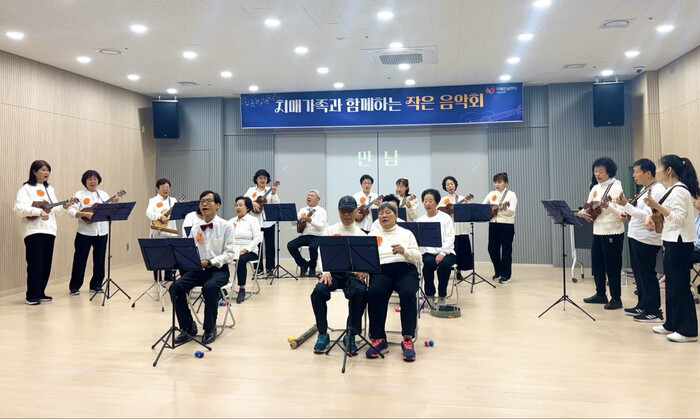 이번 음악회는 시흥시치매안심센터가 운영한 12회기 가족 음악 힐링 프로그램의 성과를 공유하는 자리로, 치매 환자와 가족들이 꾸준히 연습해 온 결과물을 무대에서 선보이며 의미를 더했다. 무대에 오른 치매가족 예술단 ‘뷰티풀 메모리즈’는 치매 환자와 가족, 시니어 서포터즈, 자원봉사자 등 21명으로 구성돼 우쿨렐레 연주와 합창 등을 통해 따뜻한 감동을 전했다.